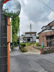 丸山4丁目、鎌ヶ谷市へと抜けるT字路にあるカーブミラーが