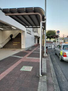 東船橋駅前、バス停の屋根に付属している排水パイプが破損しており